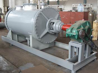 被干燥物料從殼體上方正中間加入,在不斷正反轉(zhuǎn)動的耙齒的攪拌下,物料軸向來回走動,與殼體內(nèi)壁接觸的表面不斷更新,受到蒸汽的間接加熱,耙齒的均勻攪拌,粉碎棒的粉碎,使物料表面水分更有利的排出,氣化的水分經(jīng)干式除塵器、濕式除塵器、冷凝器,從真空泵出口處放空。